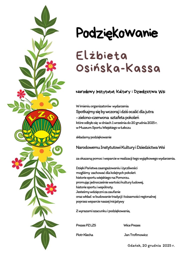 Podziękowania dla Narodowego Instytutu Kultury i Dziedzictwa Wsi za wsparcie wydarzenia „Zielono-czerwona sztafeta pokoleń”