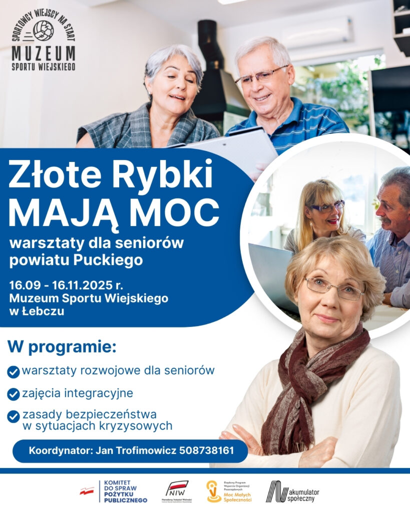 Złote Rybki naprawdę mają moc! W Muzeum Sportu Wiejskiego w Łebczu wystartował projekt dla seniorów z powiatu puckiego, który potrwa do 16 listopada. Przed nami mnóstwo wartościowych spotkań – rozwój, integracja i wiedza o bezpieczeństwie w jednym! W programie: ? warsztaty rozwojowe? wspólne zajęcia integracyjne? zasady działania w sytuacjach kryzysowych To świetna okazja, żeby aktywnie […]