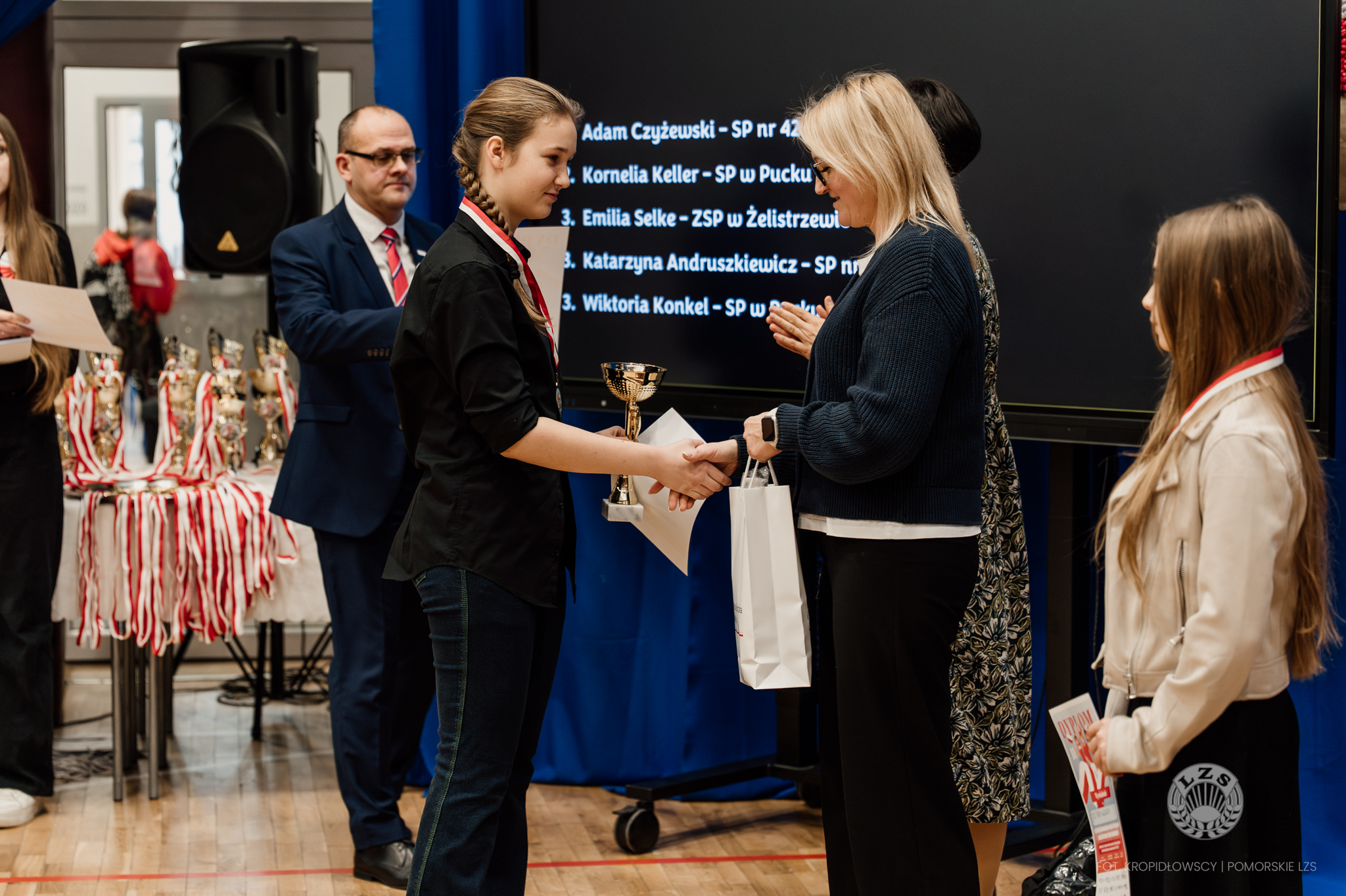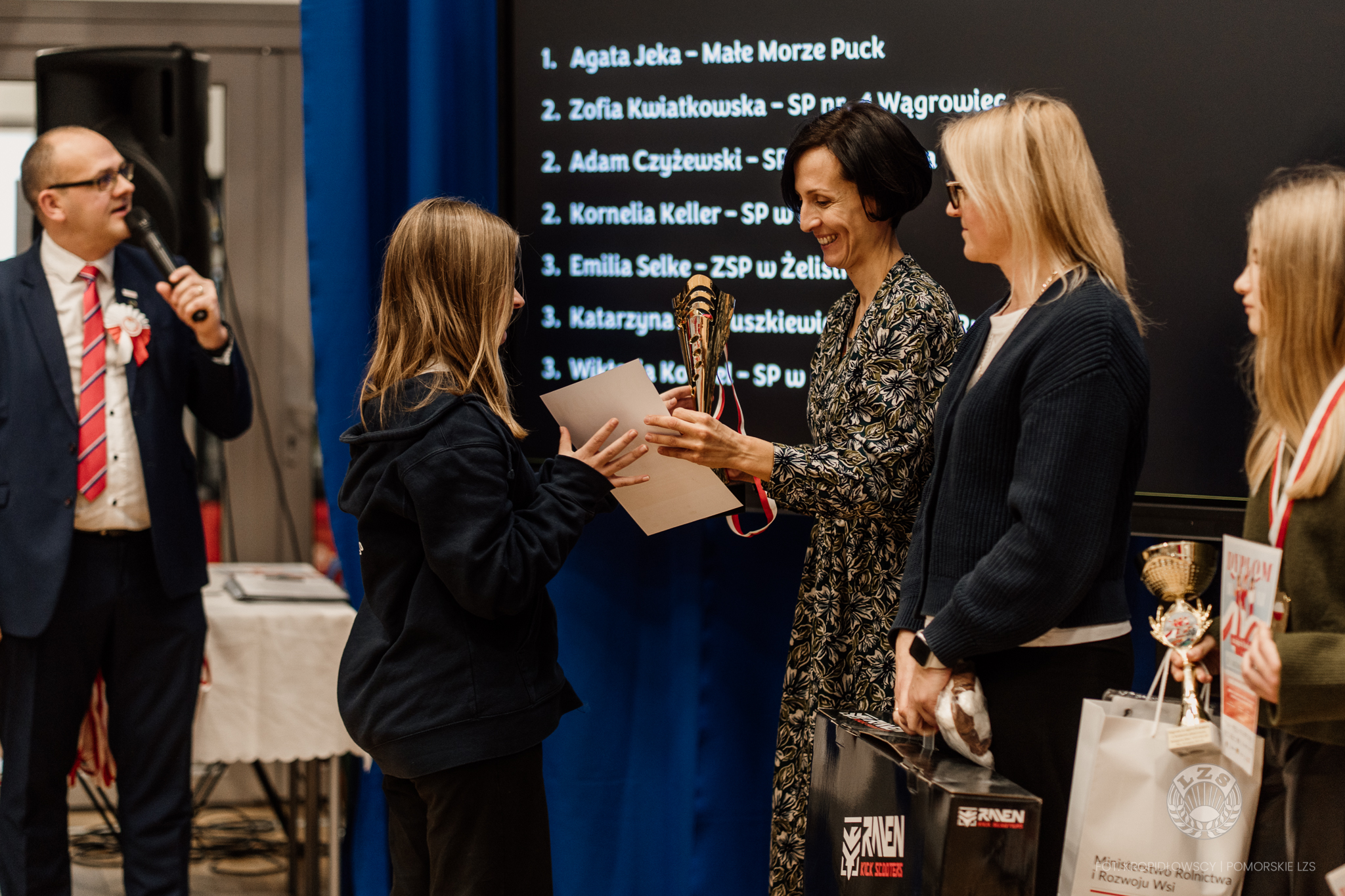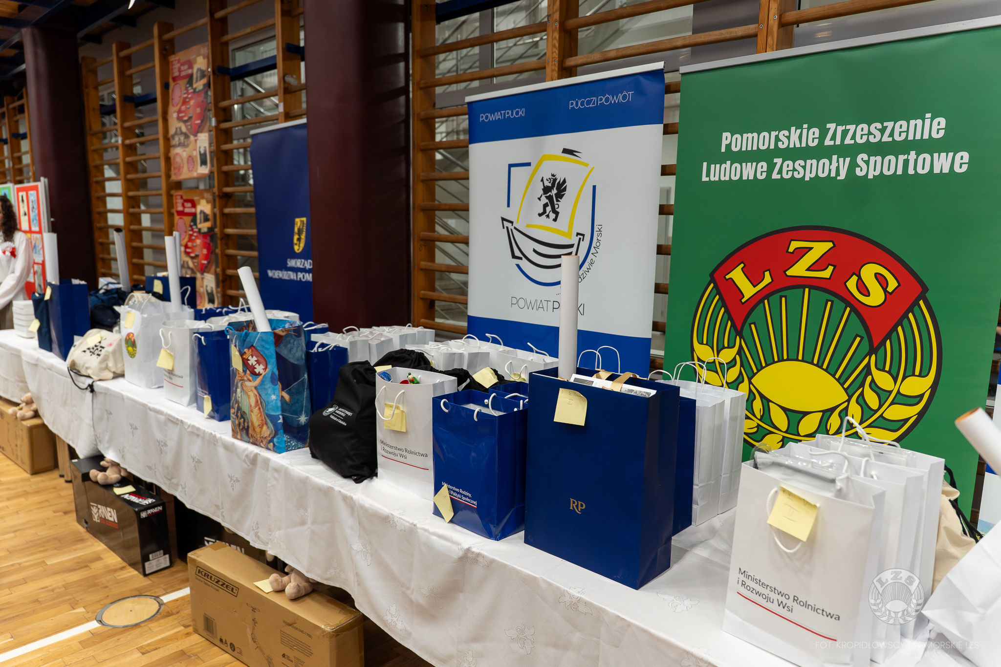 Po zakończeniu dekoracji pan dyr. Pałucki wręczył podziękowania, róże i drobne upominki członkiniom komisji konkursowej a także przybyłym gościom. Należy dodać, że upominki i nagrody dla laureatów konkursów przekazali: Kancelaria Prezydenta RP Karola Nawrockiego, Ministerstwo Rodziny, Pracy i Polityki Społecznej, Ministerstwo Rolnictwa i Rozwoju Wsi, Samorząd Województwa Pomorskiego, Pomorskie Zrzeszenie LZS w Gdańsku, Starostwo Powiatowe w Pucku, Zygmunt Labuda RTV AGD z Luzina, Pomorski Związek Piłki Nożnej