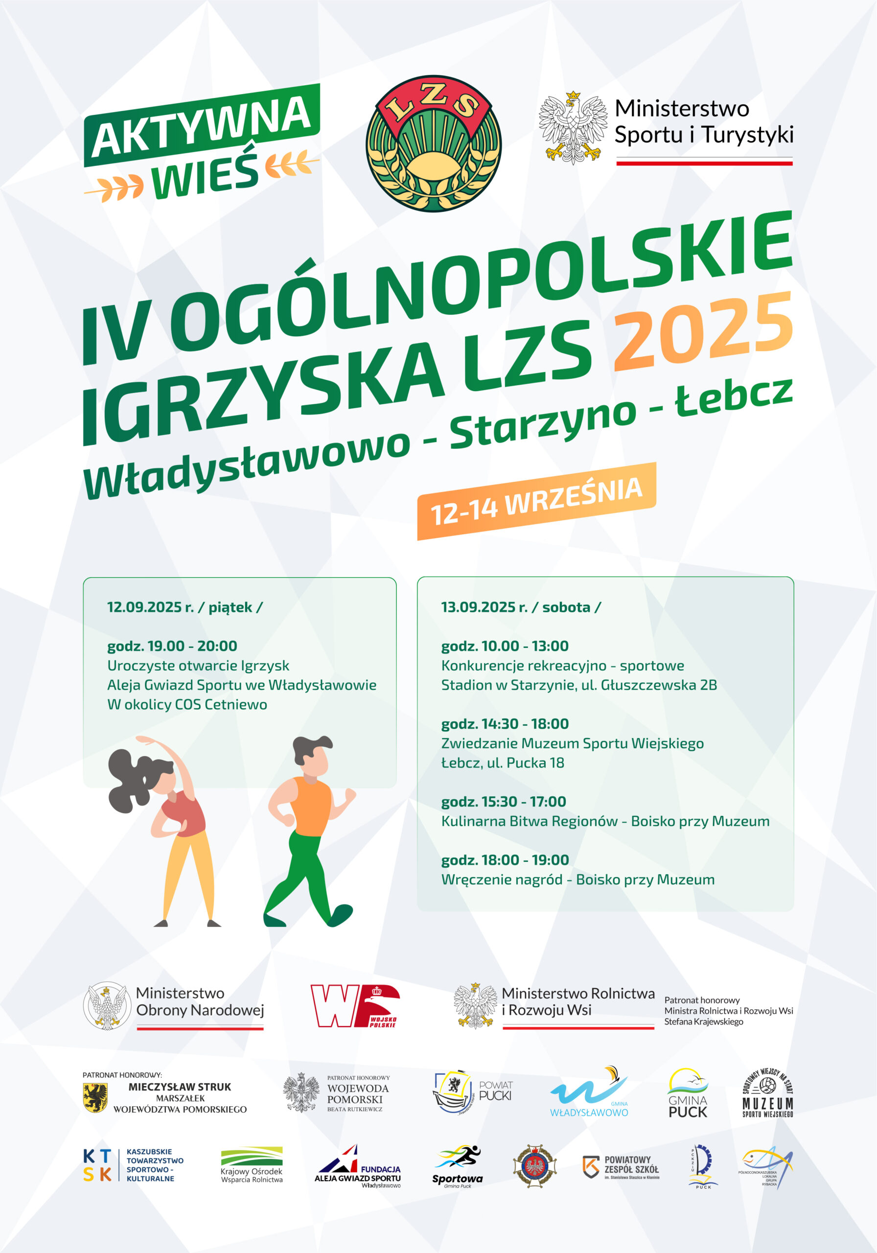 W dniach 12–14 września 2025 roku Pomorskie będzie gospodarzem jednego z największych wydarzeń sportowych na wsi – IV Ogólnopolskich Igrzysk Aktywna Wieś. Do naszego regionu przyjadą reprezentacje LZS z całej Polski, by rywalizować w konkurencjach sportowych, integrować się i wspólnie przeżywać wyjątkowe chwile.